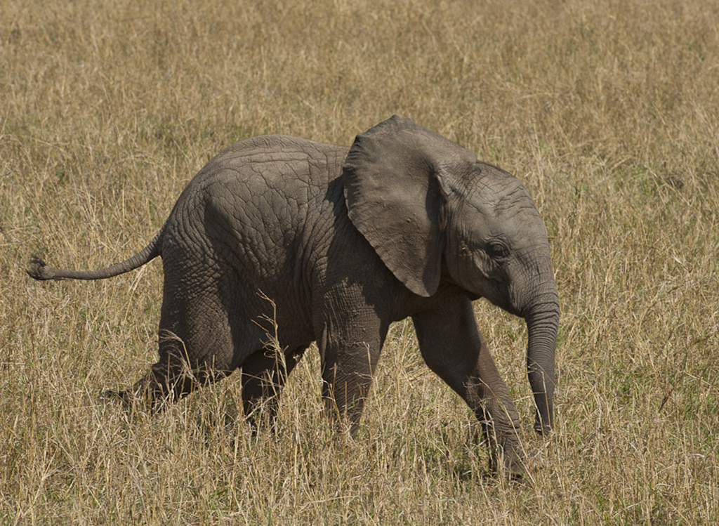 The youngest elephant from a herd of 23 elephants crossing the Lockout plain in the Masaï Mara in Kenya